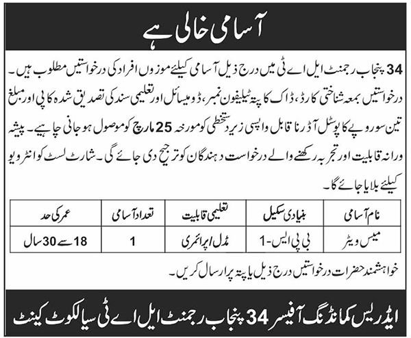 Punjab Regiment invitations purposes for job positions marketed in day by day Nawaiwaqt dated 5 March 2026 for following vacancies in Cantt Sialkot, sialkot Punjab Pakistan.