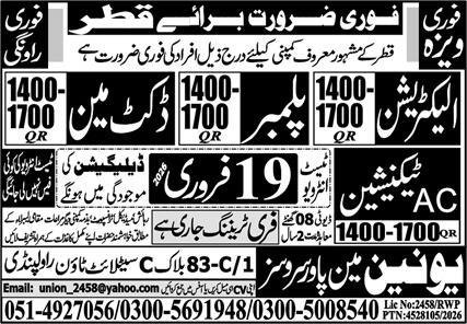 Vacant posts together with plumber, ac technician, electrician and duct man are introduced in Union Manpower Providers Doha, doha Qatar as per 17 February 2026 commercial in day by day Specific Newspaper. Most popular Training is Matric and Intermediate and many others.