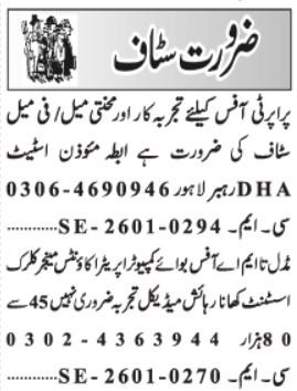 Non-public Firm invitations purposes for job positions marketed in each day Jang dated 10 January 2026 for following vacancies in DHA 11 Rahbar Lahore, lahore Punjab Pakistan.
