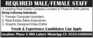Actual Property Firm is in search of candidates for following posts as per job commercial printed in day by day Jang Newspaper of February 2, 2026 for location DHA Defence Lahore, lahore Punjab Pakistan: