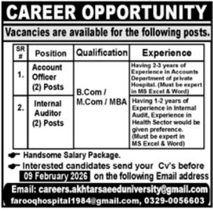Akhtar Saeed College invitations functions for job positions marketed in every day Jang dated 2 February 2026 for following vacancies in Lahore, lahore Punjab Pakistan.