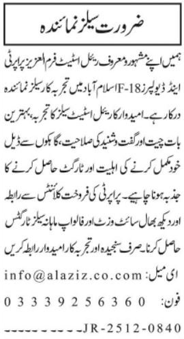 Al Aziz Property & Builders Faisal City – F-18 Islamabad, islamabad Islamabad Pakistan invitations functions from eligible candidates for the put up of gross sales employees, salesman, fee agent and actual property agent as per commercial of December 30, 2025 printed in each day Jang Newspaper. Academic {qualifications} required Matric, Bachelor and Intermediate and many others.