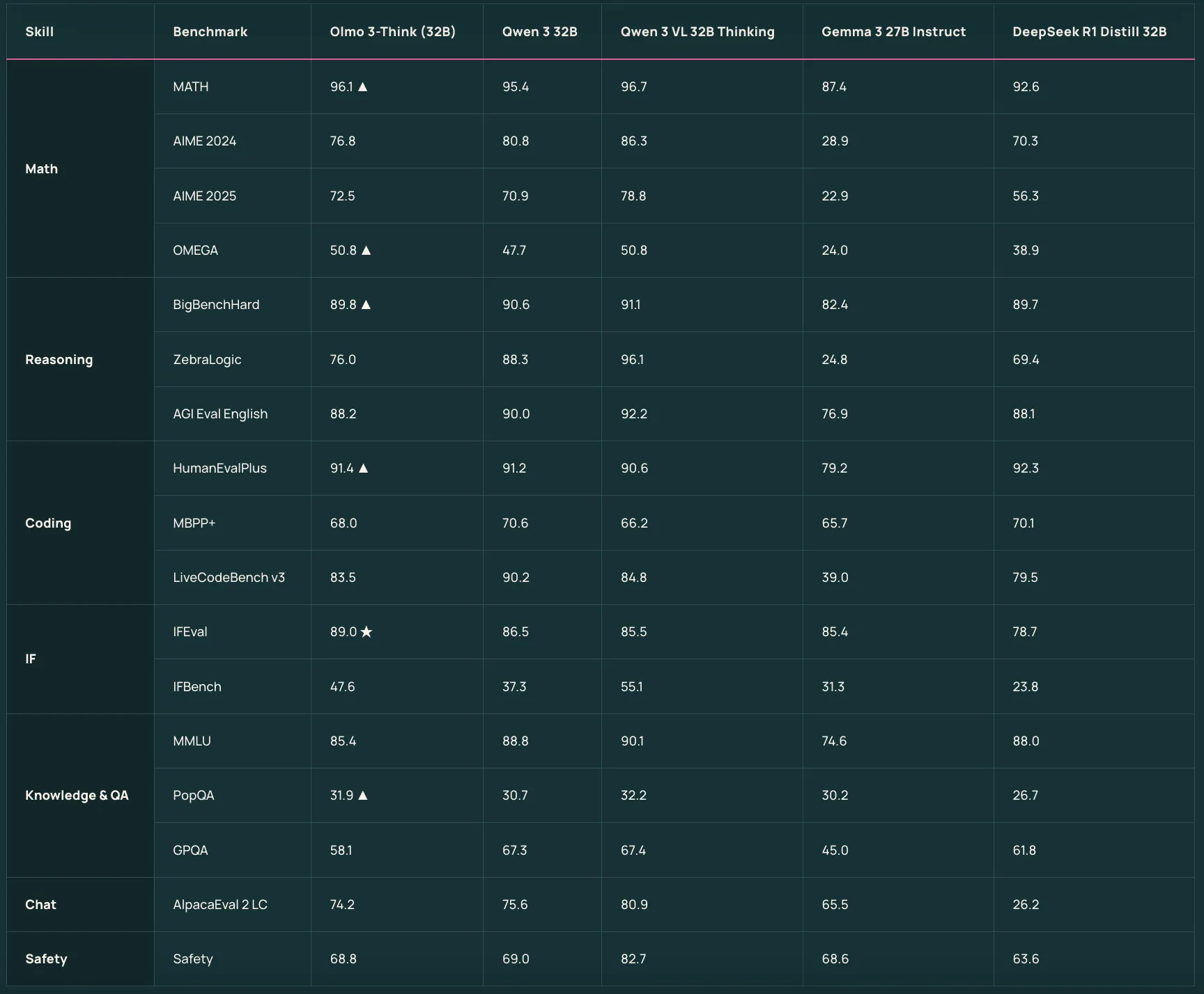 | Olmo 3 Instruct 7B | Olmo 3 Base 7B, plus Dolci Instruct SFT, Dolci Instruct DPO, Dolci Instruct RL 7B | Instruction following, chat, perform calling, device use | Reported to outperform Qwen 2.5, Gemma 3, Llama 3 and to slim the hole to Qwen 3 households at comparable scale |