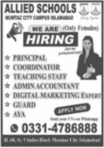 Allied Faculties jobs commercial dated about 9 February 2026 in day by day Jang Newspaper invitations software for the vacant put up of guard, admin accountant, principal, aya, coordinator, instructing employees and digital advertising skilled in Islamabad, islamabad Islamabad Pakistan. Most well-liked Schooling is Bachelor, Grasp and MS and so forth.