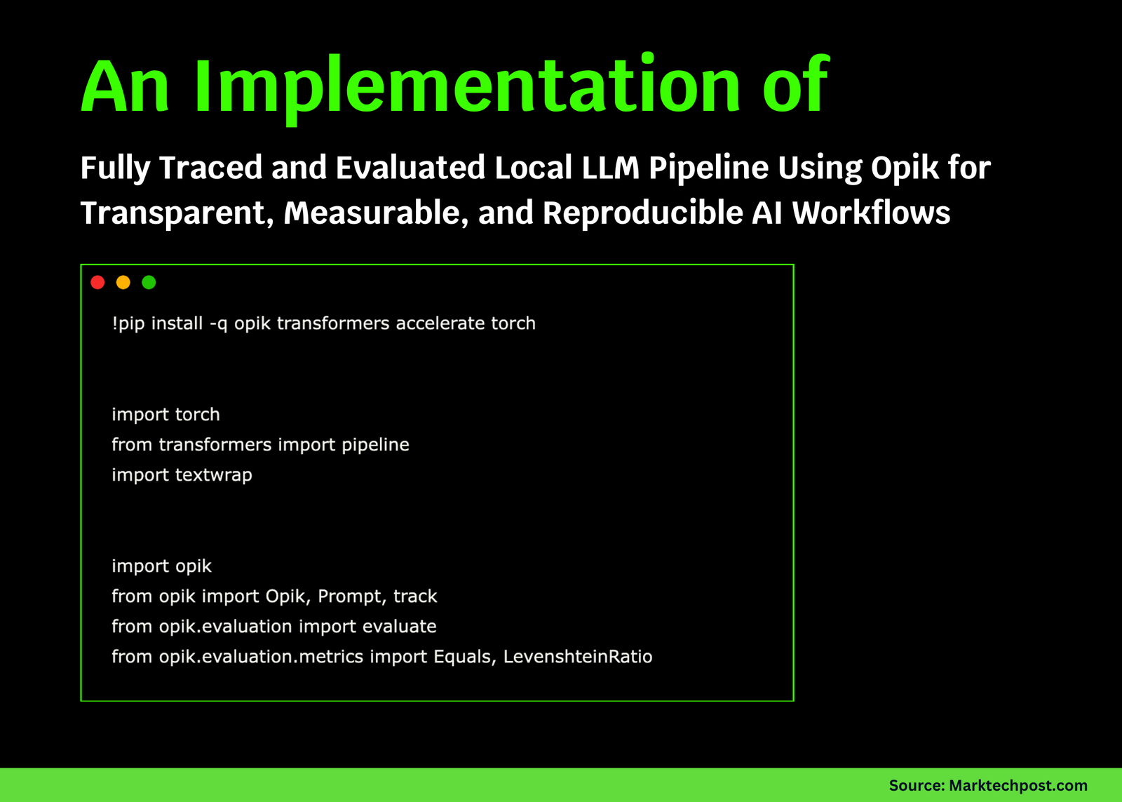 On this tutorial, we implement an entire workflow for constructing, tracing, and evaluating an LLM pipeline utilizing Opik. We construction the system step-by-step, starting with a light-weight mannequin, including prompt-based planning, making a dataset, and eventually working automated evaluations. As we transfer via every snippet, we see how Opik helps us observe each operate span, visualize the pipeline’s habits, and measure output high quality with clear, reproducible metrics. By the tip, we now have a completely instrumented QA system that we will lengthen, examine, and monitor with ease. Take a look at the FULL CODES here.