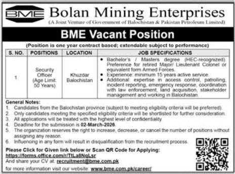 Vacant posts together with safety officer are introduced in Bolan Mining Enterprises Khuzdar, khuzdar Balochistan Pakistan as per 17 February 2026 commercial in day by day Jang Newspaper. Individuals with Grasp and Bachelor and so on. schooling can apply.