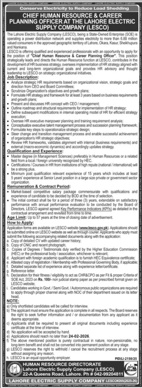 Vacant posts together with chief human useful resource profession planning officer are introduced in Lahore Electrical Provide Firm LESCO Queens Street Lahore, lahore Punjab Pakistan as per 11 February 2026 commercial in each day Jang Newspaper. Candidates with Grasp and so forth. academic background can be most popular.