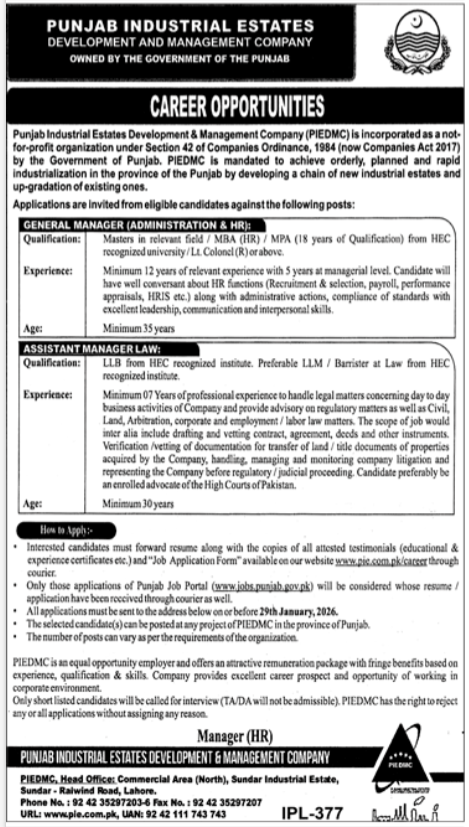 Vacant posts together with common supervisor administration hr and assistant supervisor legislation are introduced in Punjab Industrial Estates Improvement and Administration Firm PIEDMC Raiwind Street Lahore, lahore Punjab Pakistan as per 12 January 2026 commercial in every day Jang Newspaper. Individuals with Others, MBA and LLb and many others. training can apply.