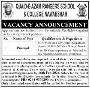 Quaid e Azam Rangers College & School Nawabshah, nawabshah Sindh Pakistan invitations functions from eligible candidates for the publish of pricipal as per commercial of February 1, 2026 revealed in each day Jang Newspaper. Academic {qualifications} required Grasp, MA, M.sc, M.ed and Mphil and so on.