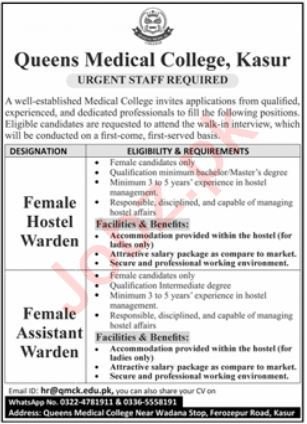 Vacant posts together with feminine assistant warden and feminine hostel warden are introduced in Queens Medical Faculty Kasur, kasur Punjab Pakistan as per 19 January 2026 commercial in day by day Jang Newspaper. Instructional {qualifications} required Intermediate, Bachelor and Grasp and so on.