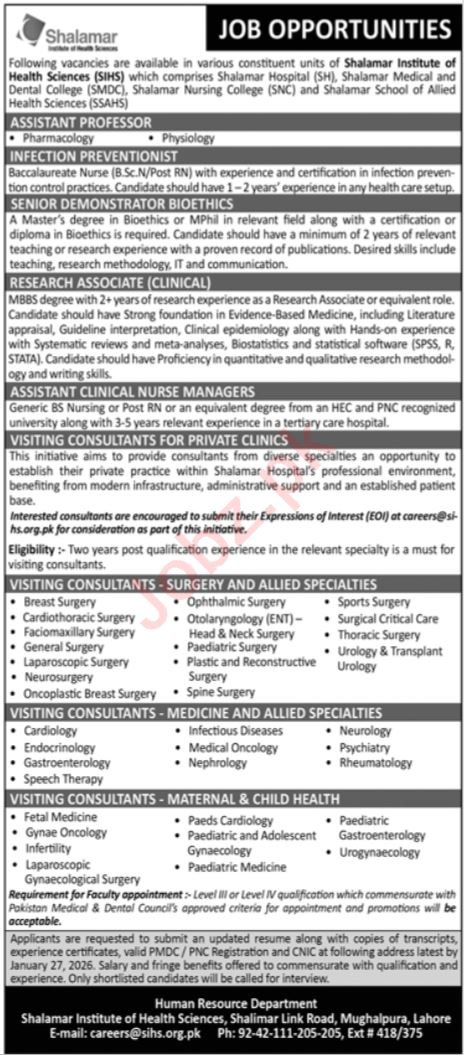 Shalamar Institute of Well being Sciences Mughalpura Lahore, lahore Punjab Pakistan invitations functions from eligible candidates for the put up of assistant scientific nurse managers, an infection preventionist, analysis affiliate scientific, sr demonstrator bioethics, visiting consultants and assistant professor as per commercial of January 19, 2026 revealed in every day Jang Newspaper. Individuals with Bachelor, MBBS, Grasp, Others and BDS and many others. schooling can apply.