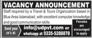 Journey & Excursions Firm jobs commercial dated about 29 December 2025 in each day Jang Newspaper invitations software for the vacant put up of male feminine workers in Blue Space Islamabad, islamabad Islamabad Pakistan. Academic {qualifications} required Intermediate and Matric and many others.