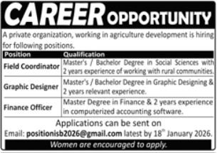 Non-public Organisation Rawalpindi, rawalpindi Punjab Pakistan invitations purposes from eligible candidates for the publish of subject coordinator, finance officer and graphic designer as per commercial of January 13, 2026 printed in every day Jang Newspaper. Candidates with Bachelor and Grasp and so forth. instructional background can be most popular.