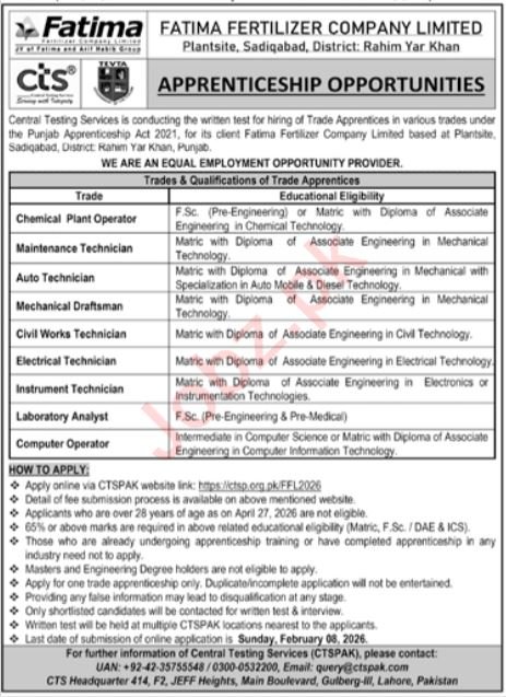 Apprenticceship Program at Fatima Fertilizer Firm Restricted 2026 Job Commercial Pakistan