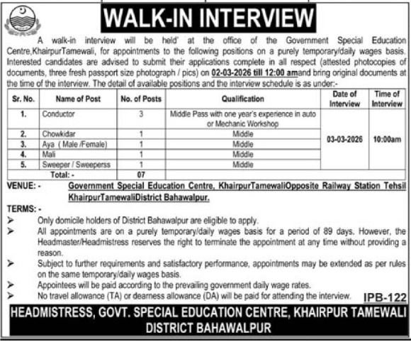 Authorities Particular Training Centre invitations functions for job positions marketed in each day Every day Pakistan dated 27 February 2026 for following vacancies in Bahawalpur, bahawalpur Punjab Pakistan.
