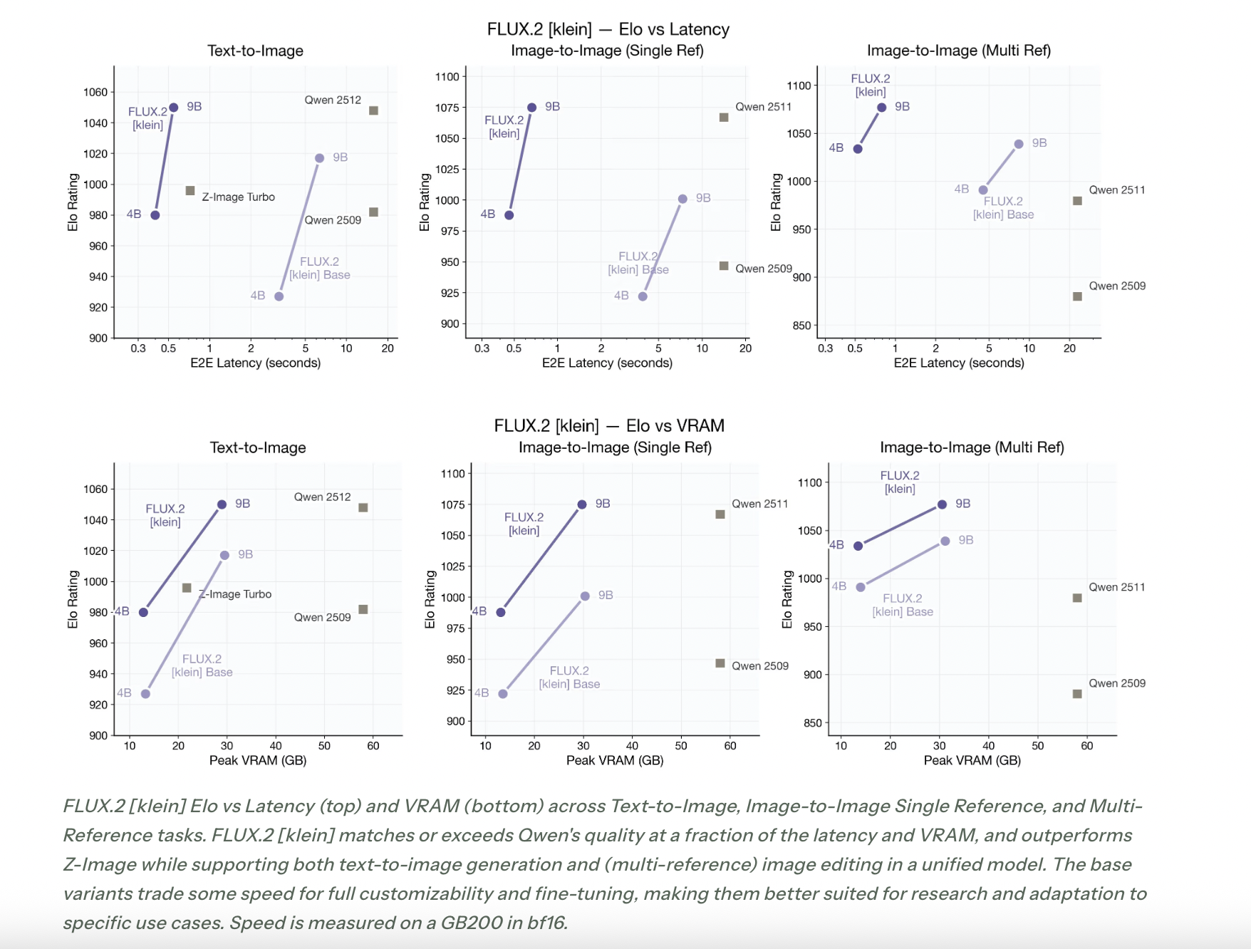 Black Forest Labs evaluates FLUX.2 [klein] by means of Elo type comparisons on textual content to picture, single reference enhancing, and multi reference duties. The efficiency charts present FLUX.2 [klein] on the Pareto frontier of Elo rating versus latency and Elo rating versus VRAM.The commentary states that FLUX.2 [klein] matches or exceeds the standard of Qwen primarily based picture fashions at a fraction of the latency and VRAM, and that it outperforms Z Picture whereas supporting unified textual content to picture and multi reference enhancing in a single structure.