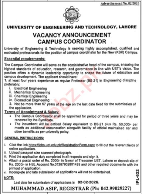 College of Engineering and Know-how UET Lahore, lahore Punjab Pakistan invitations purposes from eligible candidates for the submit of campus coordinator as per commercial of January 20, 2026 printed in day by day Jang Newspaper. Individuals with Grasp and Bachelor and so forth. schooling can apply.