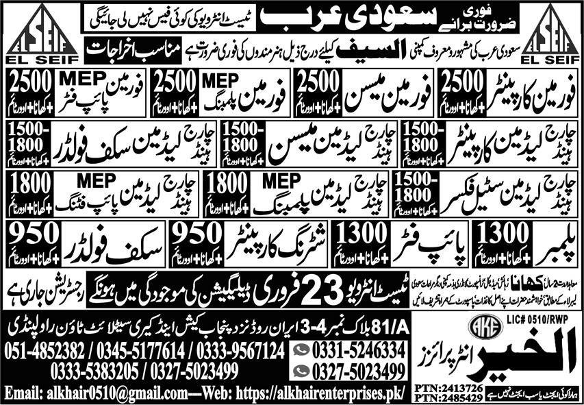 Al Khair Enterprises jobs commercial dated about 19 February 2026 in every day Specific Newspaper invitations utility for the vacant publish of chargehand carpenter, block mason, lead man mason, chargehand metal fixer, chargehand mep pipe becoming, lead man carpenter, foreman mep plumbing, foreman scaffolder, chargehand scaffolder, shuttering carpenter, pipe fitter, lead man mep plumbing, plumber, foreman mep pipe fitter, chargehand mason, scaffolder, lead metal fixer, chargehand mep plumbing, foreman mason, foreman carpenter, lead mep pipe becoming and lead man scaffolder in Taif, jeddah Saudi Arabia. Academic {qualifications} required Intermediate, Matric and Bachelor and so forth.