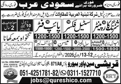 Qureshi Manpower Bureau jobs commercial dated about 12 February 2026 in each day Categorical Newspaper invitations software for the vacant put up of dump truck driver, pipe fitter, truck driver, mason, driver, shuttering carpenter, civil engineer, head of labor and metal fixer in Riyadh, tabuk Saudi Arabia. Instructional {qualifications} required Bachelor, Intermediate, Matric and DAE and so on.