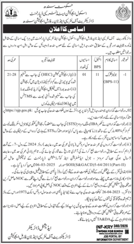 College Training and Literacy Division is in search of candidates for following posts as per job commercial printed in every day Jang Newspaper of January 31, 2026 for location Karachi, karachi Sindh Pakistan: