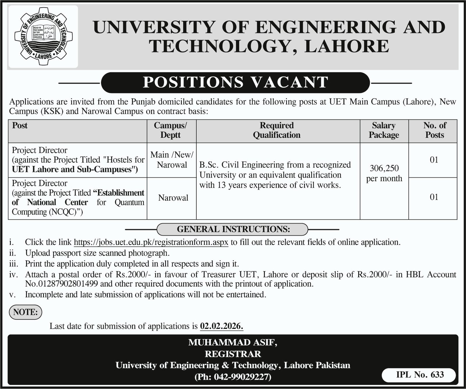College of Engineering and Expertise UET jobs commercial dated about 20 January 2026 in day by day Different Newspaper invitations utility for the vacant publish of challenge director in Lahore, lahore Punjab Pakistan. Most popular Training is Bachelor and many others.