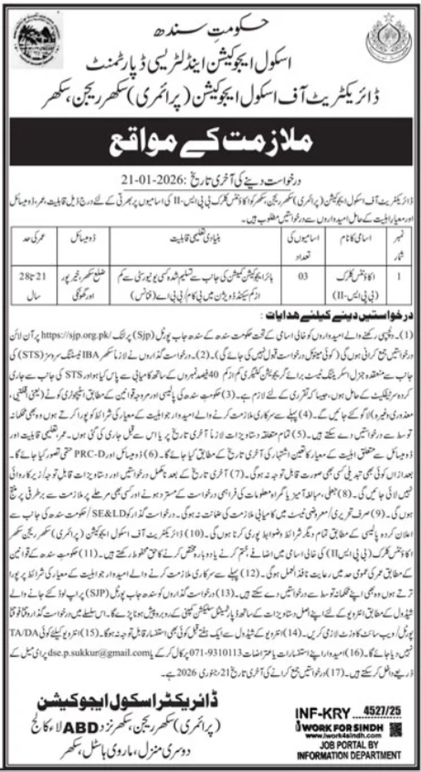 College Schooling & Literacy Division is searching for candidates for following posts as per job commercial revealed in day by day Jang Newspaper of December 31, 2025 for location Sukkur, sukkur Sindh Pakistan: