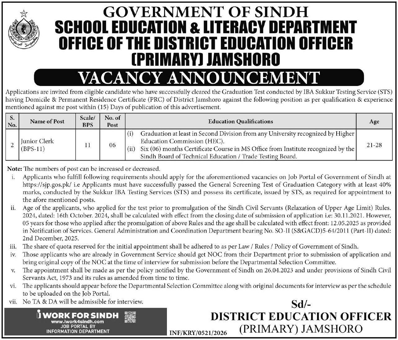 College Training & Literacy Division Jamshoro, jamshoro Sindh Pakistan invitations purposes from eligible candidates for the put up of clerk and junior clerk as per commercial of February 13, 2026 revealed in day by day Specific Tribune Newspaper. Instructional {qualifications} required Bachelor, DAE and Others and so forth.