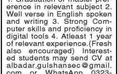 Private Company invites applications for job positions advertised in daily Dawn dated 6 April 2026 for following vacancies in Karachi, karachi Sindh Pakistan.