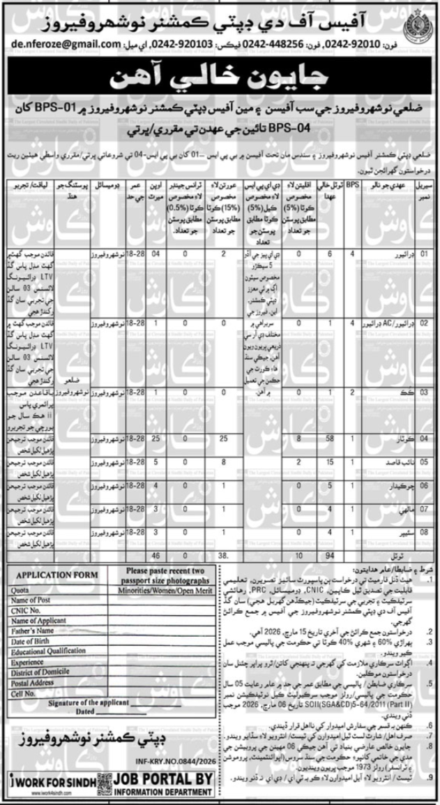 Deputy Commissioner District Workplace Naushahro Feroze, naushahro feroze Sindh Pakistan invitations purposes from eligible candidates for the submit of prepare dinner, kotar, chowkidar, ac driver, sweeper, naib qasid, malhi, driver and ltv driver as per commercial of March 4, 2026 revealed in every day Kawish Newspaper. Most popular Schooling is Major and many others.