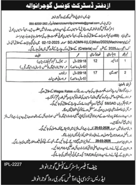 District Council Gujranwala, gujranwala Punjab Pakistan invitations purposes from eligible candidates for the put up of ltv driver, driver and sewerman as per commercial of March 5, 2026 revealed in each day Dunya Newspaper. Matric and Major and many others. instructional qualification will likely be most popular.