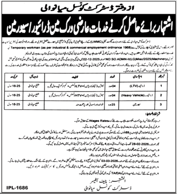 District Council jobs commercial dated about 15 February 2026 in each day Jang Newspaper invitations utility for the vacant submit of driver ltv, driver heavy automobile, driver and sewer man in Mianwali, mianwali Punjab Pakistan. Matric, Major and Center and so forth. instructional qualification can be most popular.