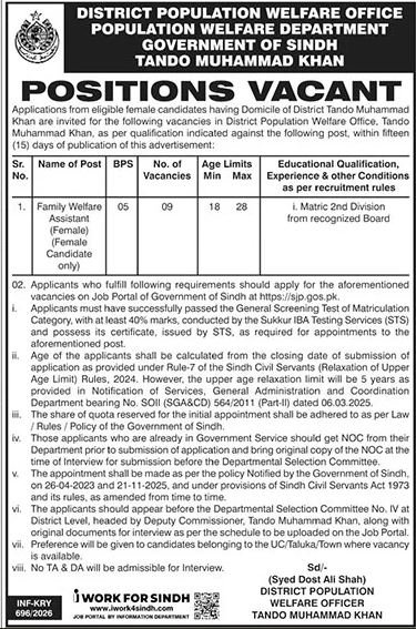 District Inhabitants Welfare Workplace is searching for candidates for following posts as per job commercial printed in each day The Information Newspaper of February 24, 2026 for location Tando Muhammad Khan, tando muhammad khan Sindh Pakistan: