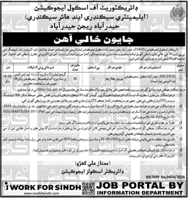 Elementary and Secondary Schooling Division ESED jobs commercial dated about 9 February 2026 in every day Kawish Newspaper invitations utility for the vacant submit of clerk and jnr clerk in Hyderabad, hyderabad Sindh Pakistan. Candidates with Intermediate and Bachelor and many others. instructional background will probably be most popular.