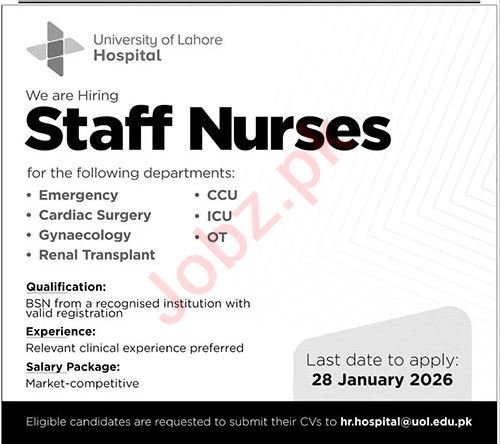 Vacant posts together with employees nurse are introduced in College of Lahore Lahore, lahore Punjab Pakistan as per 18 January 2026 commercial in each day The Information Newspaper. Candidates with and many others. academic background might be most popular.