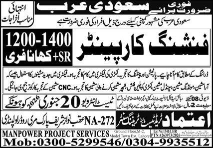 Vacant posts together with ending carpenter are introduced in Atimad Commerce Take a look at & Coaching Middle Dammam, tabuk Saudi Arabia as per 17 January 2026 commercial in each day Specific Newspaper. Matric and Intermediate and many others. instructional qualification might be most well-liked.