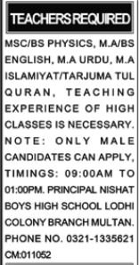 Nishat Boys Excessive Faculty jobs commercial dated about 10 January 2026 in every day Nawaiwaqt Newspaper invitations software for the vacant publish of islamiyat instructor, tarjuma tul quran instructor, physics instructor, instructor, english instructor and urdu instructor in Lodhi Colony Multan, multan Punjab Pakistan. Candidates with Intermediate, MA, Bachelor, M.sc and Grasp and many others. academic background will probably be most well-liked.