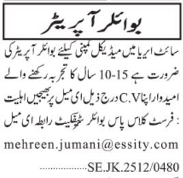 Essity Pakistan Restricted SITE Part 2 Karachi, karachi Sindh Pakistan invitations purposes from eligible candidates for the put up of boiler operator as per commercial of December 30, 2025 printed in each day Jang Newspaper. Intermediate and Bachelor and so forth. academic qualification will probably be most well-liked.
