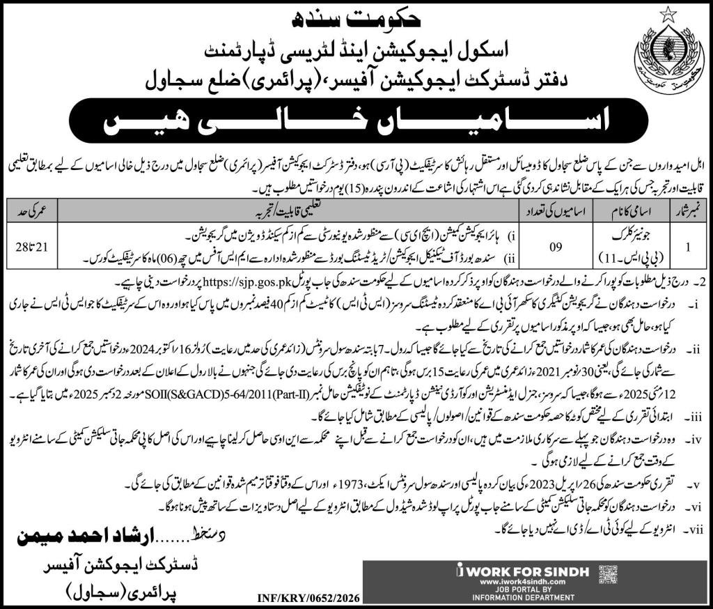 Faculty Schooling & Literacy Division is in search of candidates for following posts as per job commercial printed in day by day Categorical Newspaper of February 23, 2026 for location Nawabshah, nawabshah Sindh Pakistan: