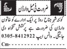 Feminine Warden & Warden Jobs 2026 in Quetta 2025 Job Commercial Pakistan