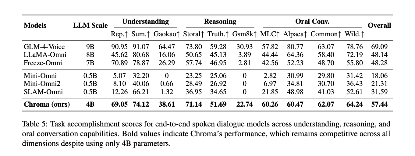 Chroma is evaluated on the fundamental observe of URO Bench. It makes use of solely 4B parameters but achieves an general process accomplishment rating of 57.44%. GLM-4 Voice, a 9B parameter mannequin, leads with 69.09%. Chroma ranks second general and outperforms a number of 7B and 0.5B omni baselines on many dimensions. It reaches 71.14% on Storal, 51.69% on TruthfulQA and 22.74% on GSM8K. For oral dialog metrics it attains the best scores on MLC at 60.26% and on CommonVoice at 62.07%.