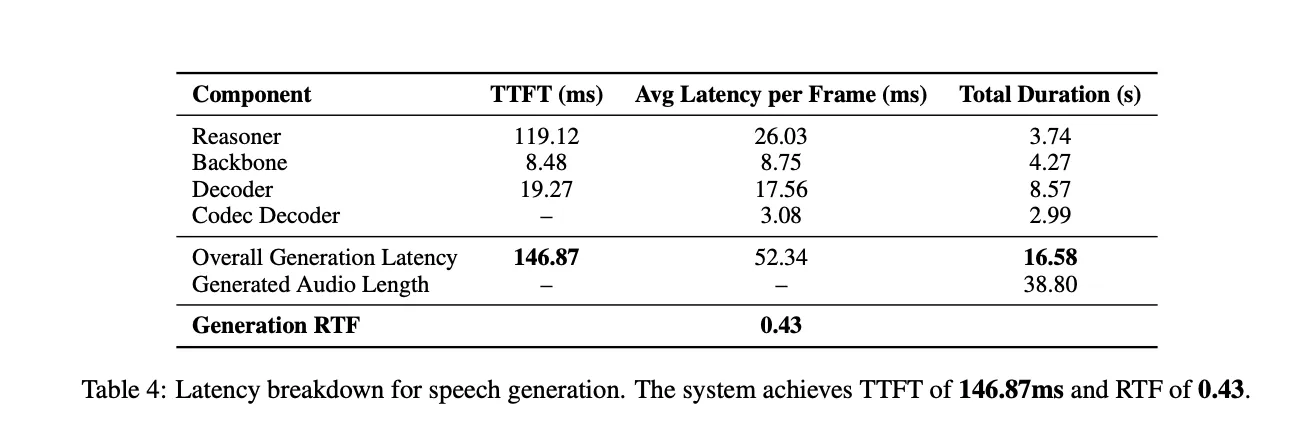 Latency is measured with one concurrent stream. For a 38.80 second response, the entire era time is 16.58 seconds, which provides a Actual Time Issue (RTF) of 0.43. The Reasoner contributes 119.12 ms TTFT, the Spine 8.48 ms and the Decoder 19.27 ms per body on common. The Codec Decoder works on teams of 4 frames so TTFT doesn’t apply to that element. The general Time to First Token is 146.87 ms, which is nicely beneath one second and appropriate for interactive dialogue.