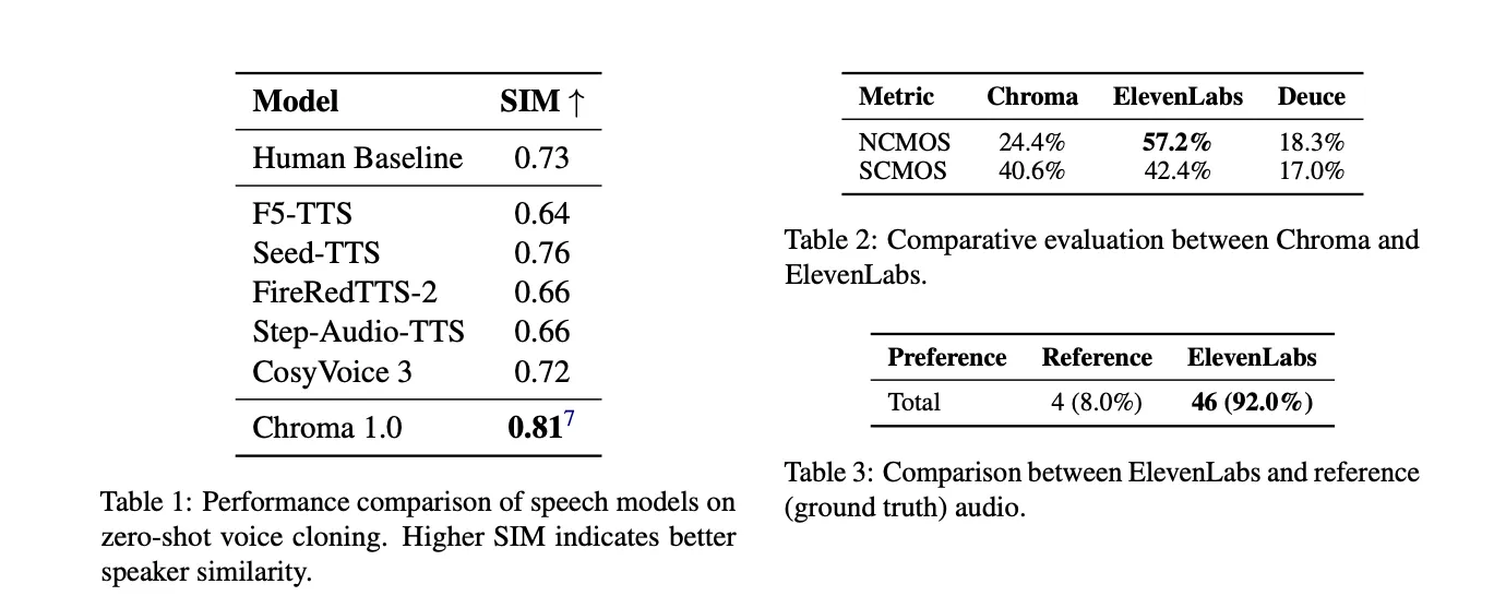Subjective analysis compares Chroma with the ElevenLabs eleven_multilingual_v2 mannequin. In naturalness CMOS, listeners favor ElevenLabs 57.2% of the time versus 24.4% for Chroma, with 18.3% deuce. In speaker similarity CMOS, the scores are very shut, 42.4% for ElevenLabs and 40.6% for Chroma, with 17.0% deuce. A comply with up check asking which audio sounds extra pure between ElevenLabs and the unique recordings yields 92.0% desire for ElevenLabs versus 8.0% for floor fact, which exhibits that perceived naturalness and speaker constancy are usually not aligned.