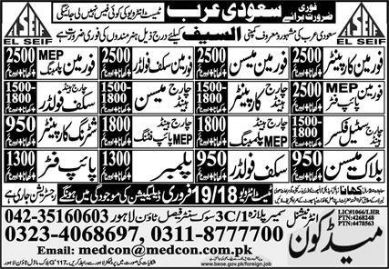 Medcon Worldwide Firm jobs commercial dated about 15 February 2026 in every day Categorical Newspaper invitations software for the vacant publish of foreman carpenter, foreman scaffolder, pipe fitter, block mason, foreman mason, mep foreman pipe fitter, scaffolder, plumber, shuttering carpenter and mep foreman plumbing in Riyadh, riyadh Saudi Arabia. Candidates with Center and so on. instructional background can be most popular.