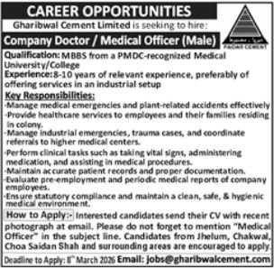 Vacant posts together with medical officer and firm physician are introduced in Gharibwal Cement Restricted Lahore, lahore Punjab Pakistan as per 22 February 2026 commercial in every day Jang Newspaper. Instructional {qualifications} required MBBS and many others.
