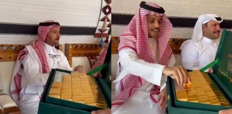 At a lavish Saudi wedding ceremony, the bride’s brother is seen in a video circulating on social media, presenting gold-colored bar-like treats to visitors, capturing consideration on-line.