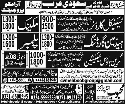 Mehboob Enterprises Abroad Employment Promoters jobs commercial dated about 26 February 2026 in day by day Specific Newspaper invitations software for the vacant put up of plumber, mechanic, greenhouse technician, headman gardening and technical gardener in Dammam, al khobar Saudi Arabia. DAE, Matric and Intermediate and so on. instructional qualification shall be most well-liked.
