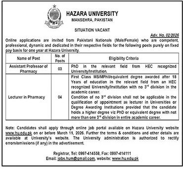 Hazara College jobs commercial dated about 4 March 2026 in each day The Information Newspaper invitations software for the vacant put up of lecturer in pharmacy and lecturer in Mansehra, mansehra Khyber Pakhtunkhwa KPK Pakistan. Individuals with MS, Grasp, Bachelor and Mphil and so on. schooling can apply.
