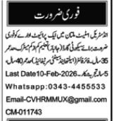 Non-public Firm invitations purposes for job positions marketed in day by day Jang dated 31 January 2026 for following vacancies in Industrial Property Multan, multan Punjab Pakistan.