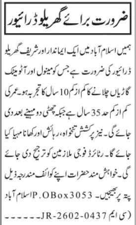 Home invitations purposes for job positions marketed in day by day Jang dated 17 February 2026 for following vacancies in Islamabad, islamabad Islamabad Pakistan.