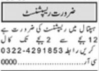 Hospital Clinic jobs commercial dated about 26 December 2025 in day by day Khabrain Newspaper invitations utility for the vacant publish of receptionist and hospital receptionist in Lahore, lahore Punjab Pakistan. Bachelor and Intermediate and so on. instructional qualification will probably be most popular.